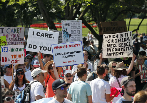 Washington'da Beyaz Saray'ın önünde toplanan protestocular ''çocuklar cezaevinde büyümesin'', ''aileler birbirine aittir'' yazılı pankartlar taşıdı. Washington'daki protestoya katılan ünlü pop müzik sanatçısı ve söz yazarı Alicia Keys, protestoda, oğlundan ayrılan bir göçmen annenin mektubunu okudu.