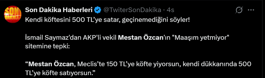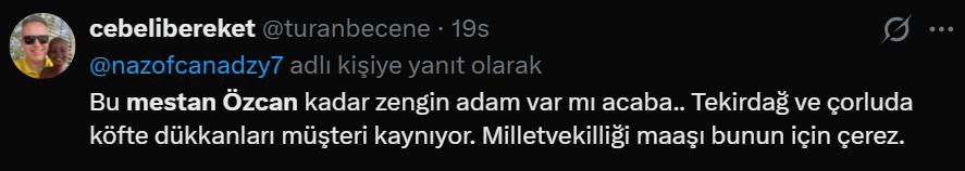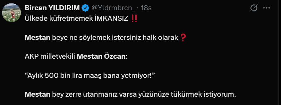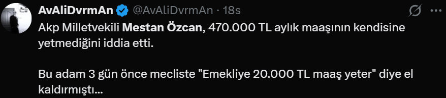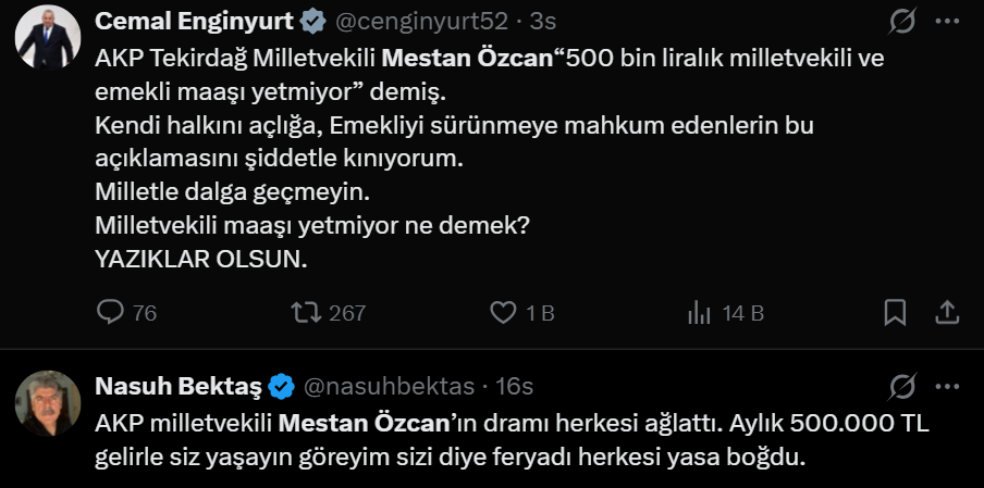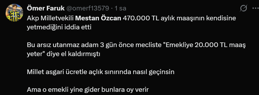 En düşük emekli maaşını 20 bin liraya yükselten yasanın Resmi Gazete'de yayımlandığı gün, AK Parti Tekirdağ Milletvekii Mestan Özcan'ın "500 bin lira maaşla geçinemiyorum" şeklindeki açıklaması, sosyal medyada büyük öfkeyle karşılandı. Açlık sınırının altında maaşla geçinmek zorunda kalan milyonlarca insan, "Özcan bizimle dalga mı geçiyor" diye tepki gösterdi.