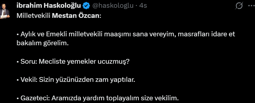 Özcan'ın açıklamaları sonrası bir basın mensubu, "Aramızda yardım toplayalım vekilim o zaman" diyerek Özcan'ı tiye aldı.