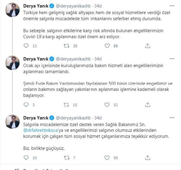 "Ocak ayı içerisinde kuruluşlarımızda bakım hizmeti alan engellilerimizin aşılanması tamamlandı. Şimdi Evde Bakım Yardımından faydalanan 500 binin üzerinde engellimiz ve onların bakımını sağlayan yakınlarının aşılanması işlemine kademeli olarak başlanıyor. Salgınla mücadelemize özel destek veren Sağlık Bakanımız Sayın Fahrettin Koca'ya ve engellilerimizi salgının olumsuz etkilerinden korumak için çalışan tüm sosyal hizmet çalışanlarımıza teşekkür ediyorum. Biz, birlikte güçlüyüz."