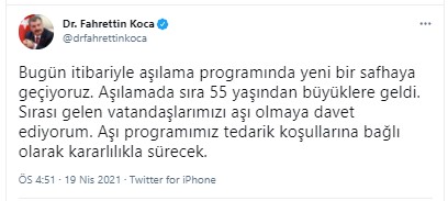 Bugün (19 Nisan 2021) itibariyle aşılama programında yeni bir safhaya geçildiğini duyuran Koca, "Aşılamada sıra 55 yaşından büyüklere geldi" bilgisini verdi. Sırası gelenleri aşı olmaya davet eden Koca, "Aşı programımız tedarik koşullarına bağlı olarak kararlılıkla sürecek" ifadesini kullandı.