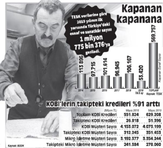 Cumhuriyet'teki habere göre bu yılın ilk yarısında 53 bin 420 esnaf iflas ederken geçen yılın aynı dönemine göre 433 adetlik artış sözkonusu. Kurulan işyeri sayısı ise kapananlarla aynı hızda değil. 2017’de 229 bin 367 işyeri için tescil yapılırken bu sayı 2018’de 69 adetlik azalış gösterdi. 2018’in ilk 6 ayında 127 bin 815 işletme için tescil başvurusu yapılırken, bu yılın ilk 6 ayında bu sayı 116 bin 960 işletmeye geriledi.