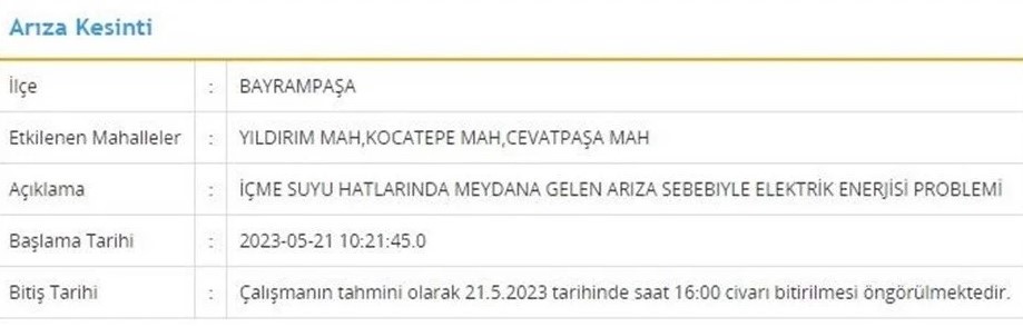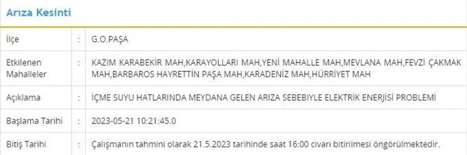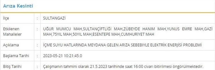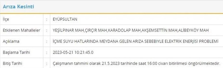 İSKİ (İstanbul Su ve Kanalizasyon İdaresi) 21 Mayıs tarihli su kesintisi programını yayımladı. İSKİ tarafından yapılan açıklamada; "Zaman zaman arızaların giderilmesinin ardından depoların ve isale hatlarının tam olarak istenen basınca ulaşması gecikebilmekte, kullanım yoğunluğundan dolayı gecikmeli olarak su alınabilmektedir." denildi.