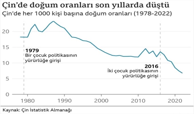 İstatistiklere göre Çin’in nüfusu, bir önceki yıla kıyasla 850 bin kişi azalıp, 1 milyar 411 milyon 80 bin kişiye geriledi. Ülkenin doğum oranları yıllardır azalıyordu ve bu eğilimi yavaşlatmak amacıyla, ülkenin tek çocuk politikası da dahil tartışmalı uygulamalar kaldırıldı.