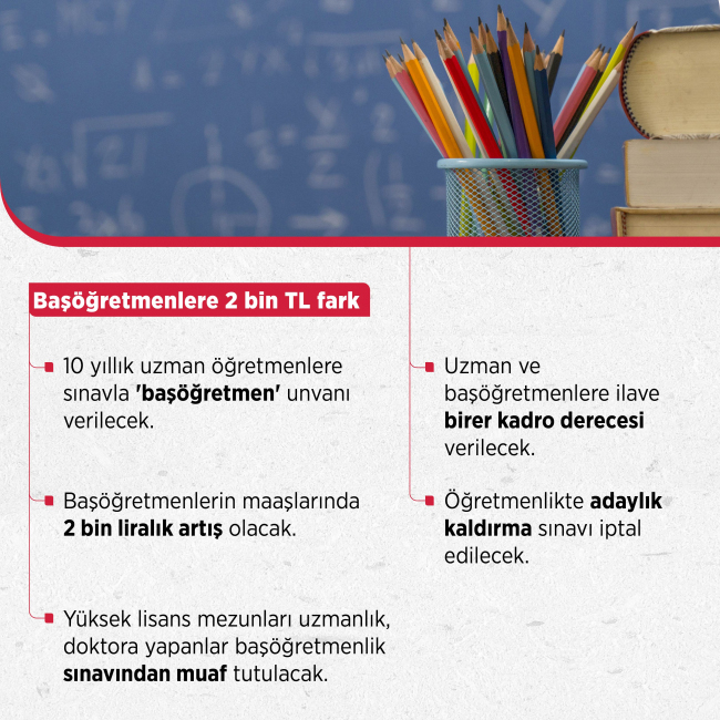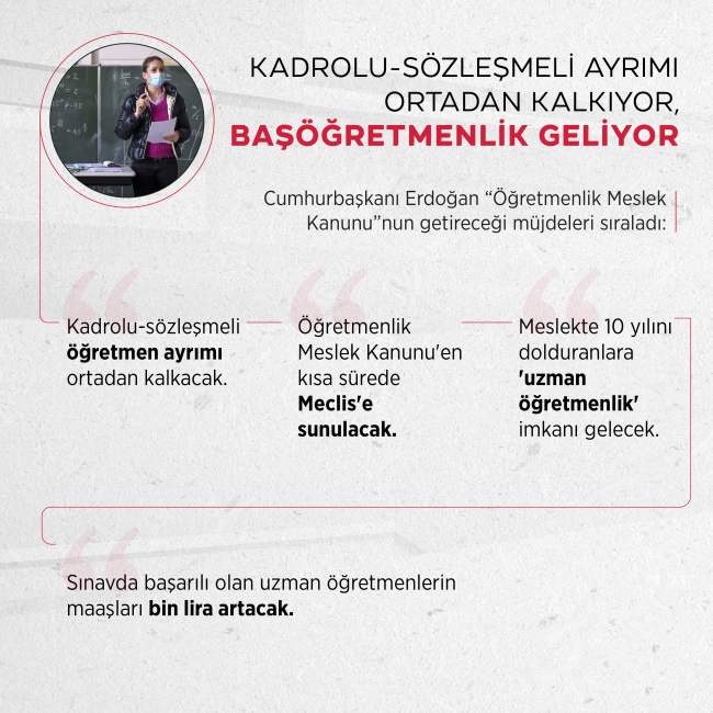 "Şu anda 1300 civarında başöğretmen arkadaşımız var. Uzman arkadaşlarımız ona göre daha çok. Mesela biz sınava girip uzman olduğumuzda aşağı yukarı 20 bin civarında arkadaşımız bunu başarmıştı. Yasa geçtikten sonra fiilen 1300 kişi başöğretmenliğe geçecek. Uzmanlar da fiilen 17-18 bin civarında olabilir, bunlar geçmiş olacak."