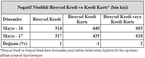 Türkiye Bankalar Birliği Risk Merkezi’nin, Negatif Nitelikli Bireysel Kredi ve Kredi Kartı Mayıs 2017 Raporu’na göre; bireysel kredi veya bireysel kredi kartı borcundan dolayı yasal takibe girenlerin sayısı yılın ilk beş ayında geçen yılın aynı dönemine göre %2 arttı.
