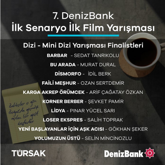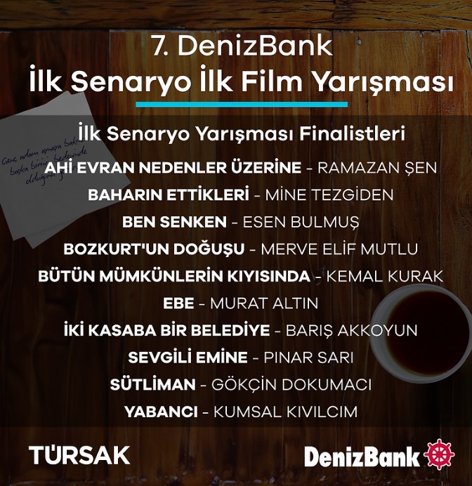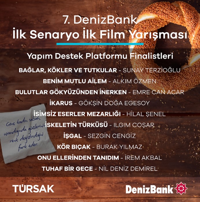 Sinemanın temelini oluşturan senaryo yazımının geliştirilmesine destek sunmak amacıyla DenizBank ve Türkiye Sinema Audiovisuel Kültür Vakfı (TÜRSAK) iş birliğiyle bu yıl 7’ncisi düzenlenen DenizBank İlk Senaryo İlk Film Yarışması’nda finale kalan projeler belirlendi. DenizBank İlk Senaryo İlk Film Yarışması’na her yıl yüzlerce senaryo ve proje başvururken; yarışmacılar maddi ve manevi katkıların yanı sıra atölye programlarında da tecrübeli yapımcı ve senaristlerle bir araya gelme olanağına kavuşuyor.