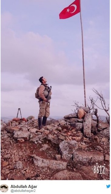 Ağar paylaşımında, "8 şehidin düştüğü, onlar şehit düşerken, bayrağın şaha kalktığı yerden. Afrin Bilal köyü güneyi 1082 RT. Dün etkisiz hale getirilen 165 teröristle Zeytin Dalı Harekatı'nda imha edilen terörist sayısı 2777'e ulaştı. 8 şehidimizden sonraki son 4 günde 555 terörist etkisizleştirildi." ifadelerini kullandı.