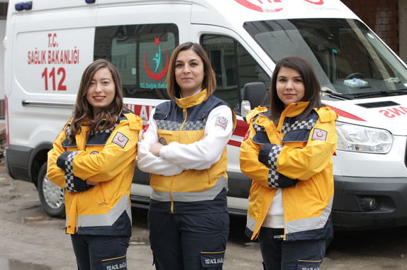 112 Acil Sağlık ekibinde görevli Büşra Sezer, Seval Ciner ve Fatma Nur (soldan sağa) “İş hayatında başarısız hiçbir kadın görmedik” diyorlar.