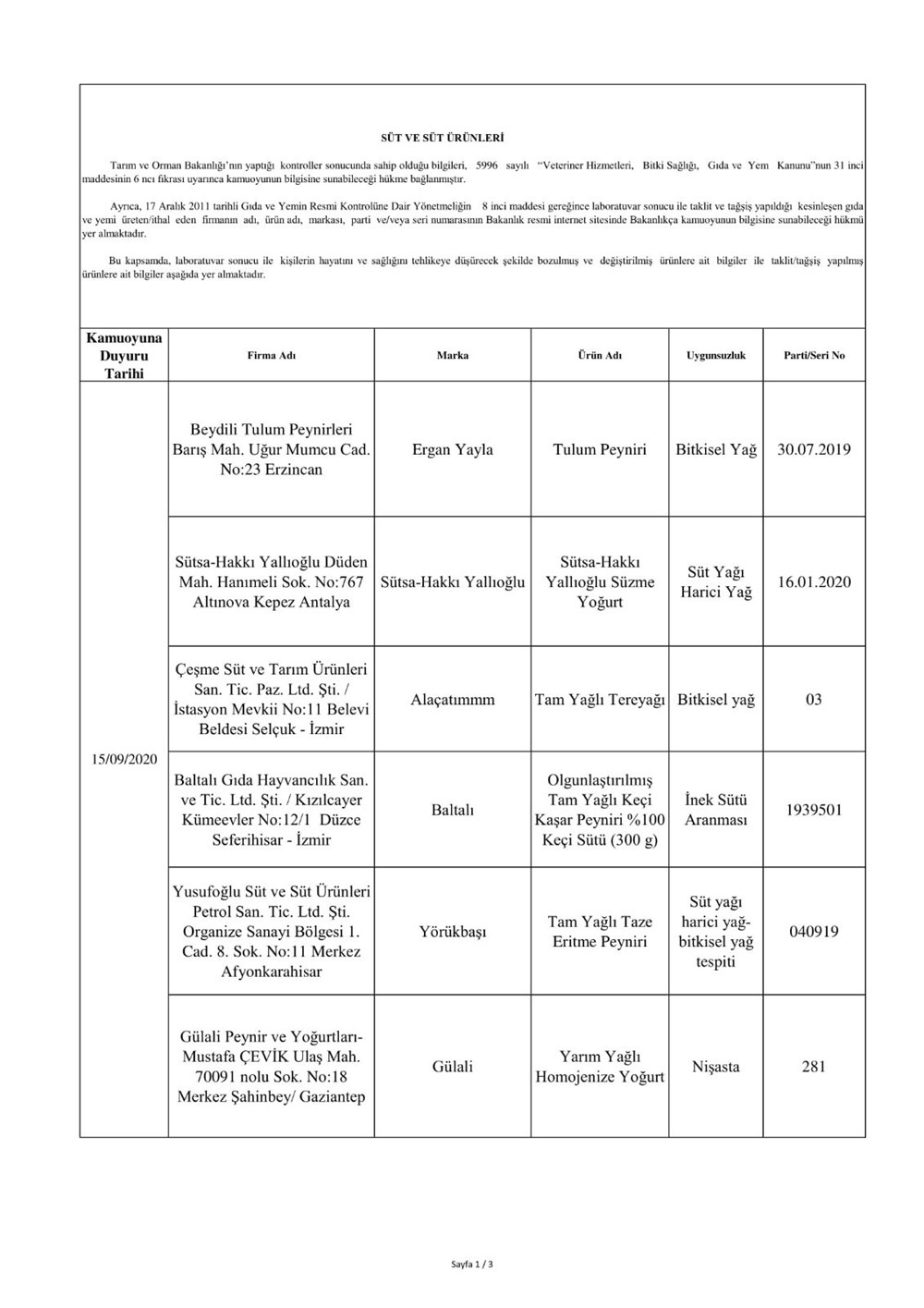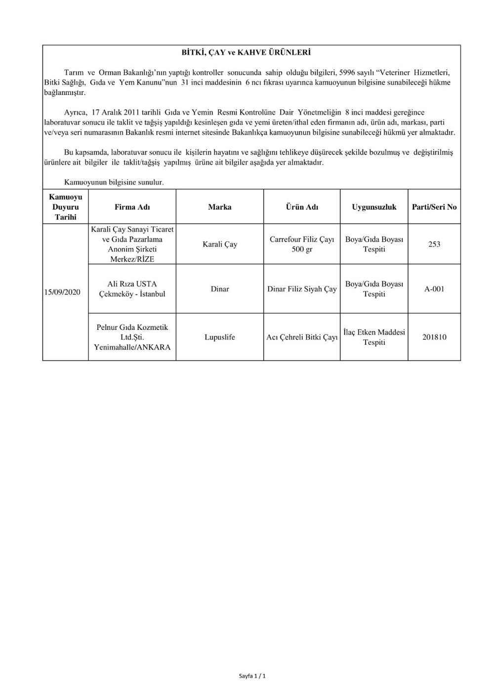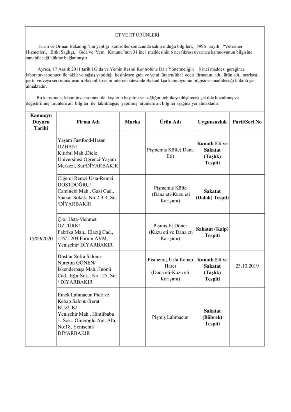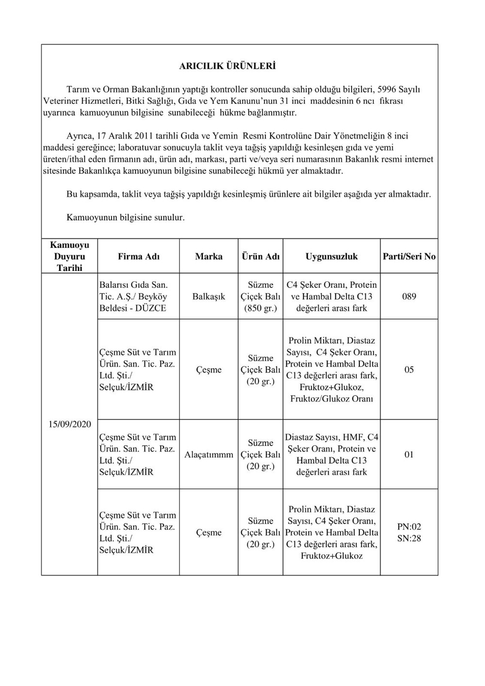 Tarım ve Orman Bakanlığı vatandaşın sağlığını korumaya, gıdada taklit ve tağşiş yapanlara göz açtırmamaya devam ediyor. Bu kapsamda, taklit, tağşiş yapıldığı veya ilaç etken maddesi ilave edildiği tespit edilen toplam 91 firmaya ait 113 parti ürün Bakanlık Gıda ve Kontrol Genel Müdürlüğü internet sitesinde kamuoyunun bilgisine sunuldu.