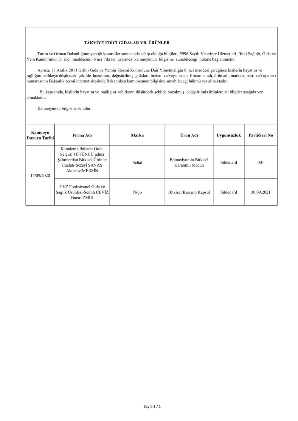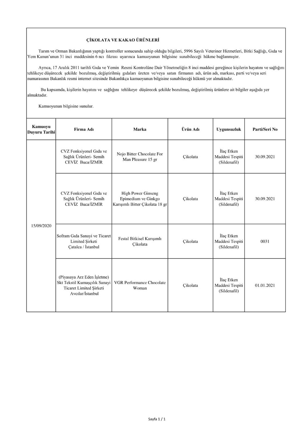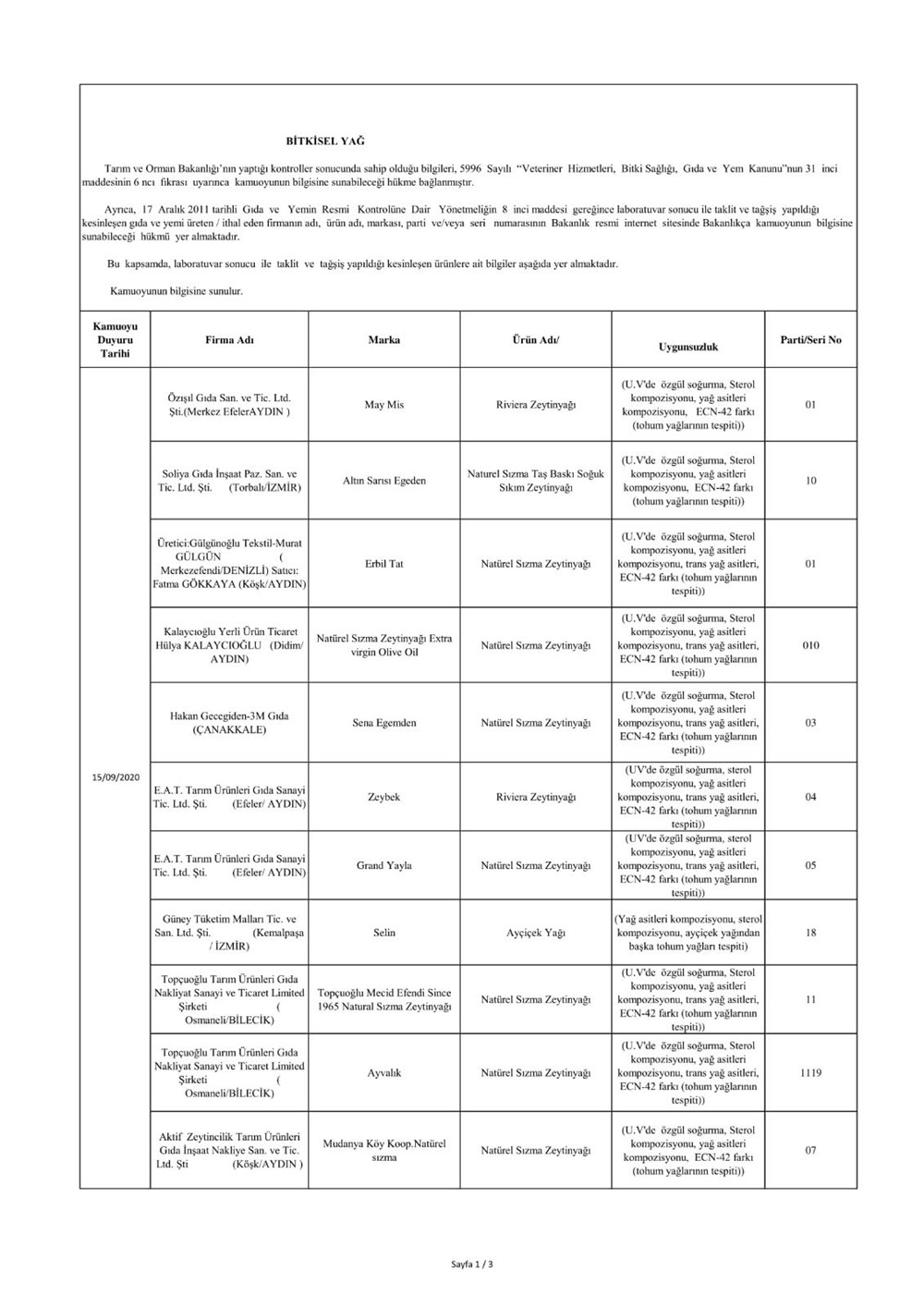 Tarım ve Orman Bakanlığı vatandaşın sağlığını korumaya, gıdada taklit ve tağşiş yapanlara göz açtırmamaya devam ediyor. Bu kapsamda, taklit, tağşiş yapıldığı veya ilaç etken maddesi ilave edildiği tespit edilen toplam 91 firmaya ait 113 parti ürün Bakanlık Gıda ve Kontrol Genel Müdürlüğü internet sitesinde kamuoyunun bilgisine sunuldu.