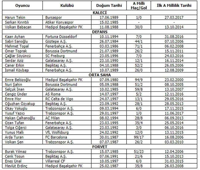A Milli Takım Teknik Direktörü Mircea Lucescu tarafından belirlenen kadroda şu isimler yer alıyor: