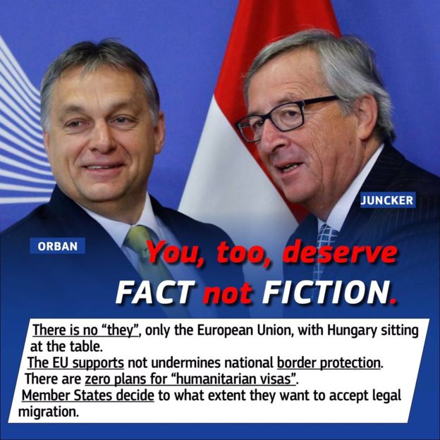 Söz konusu afişler, "ileri sürüldüğü gibi biz onlar ayrımının olmadığını, Macaristan'ın da karar alınan masada oturduğunu ve Avrupa Birliği'nin hiçbir şekilde üye ülkelerin sınır güvenliğine zarar vermek gibi bir niyetinin olmadığını" vurguluyor.