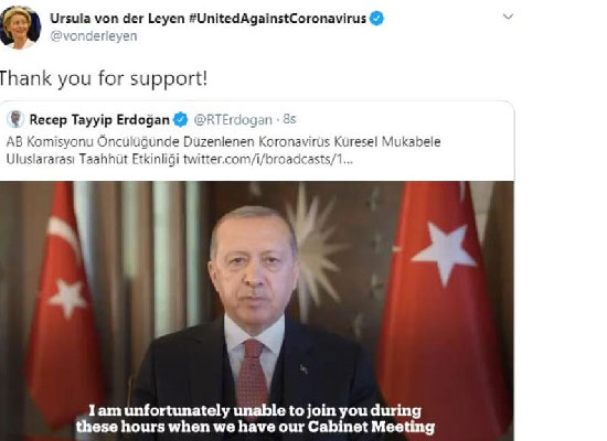 Avrupa Birliği (AB) Komisyonu Başkanı Ursula von der Leyen, "Coronavirüs Küresel Mukabele Uluslararası Taahhüt Etkinliği"ne katılan Cumhurbaşkanı Recep Tayyip Erdoğan'a teşekkür etti.