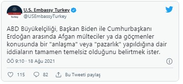 ABD Büyükelçiliği sosyal medya hesabından yaptığı açıklamada, ABD Başkanı Joe Biden ile Cumhurbaşkanı Recep Tayyip Erdoğan arasında Afgan mülteciler yada göçmenler konusunda bir "anlaşma" veya "pazarlık" yapıldığına dair iddiaları yalanladı.