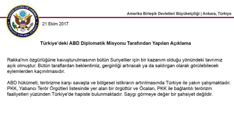 Konuyla ilgili ABD Büyükelçiliği'nin sosyal medya hesabından açıklama yapıldı. Açıklamada, "Rakka'nın özgürlüğüne kavuşturulmasını bütün Suriyeliler için bir kazanım olduğu yönündeki tavrımız açık olmuştur. Bu taraflardan beklentimiz, gerginliği arttıracak ya da saldırgan olarak görülebilecek eylemlerden kaçınılmasıdır. ABD hükümeti terörizme karşı savaşta ve bölgesel istikrarın arttırılmasında Türkiye ile yakın çalışmaktadır. PKK, Yabancı Terör Örgütleri listesinde yer alan bir örgüttür ve Öcalan, PKK ile bağlantılı terörizm faaliyetleri yüzünden Türkiye'de hapiste bulunmaktadır. Saygı görmeye değer bir şahysiyet değildir" ifadeleri yer aldı.