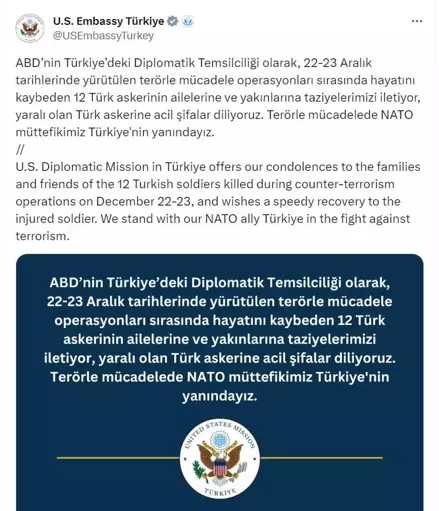 Büyükelçiliğin sosyal medya hesabından yayımlanan mesajda, "ABD'nin Türkiye'deki diplomatik temsilciliği olarak, 22-23 Aralık tarihlerinde yürütülen terörle mücadele operasyonları sırasında hayatını kaybeden 12 Türk askerinin ailelerine ve yakınlarına taziyelerimizi iletiyor, yaralı olan Türk askerine acil şifalar diliyoruz. Terörle mücadelede NATO müttefikimiz Türkiye'nin yanındayız" ifadelerine yer verildi.