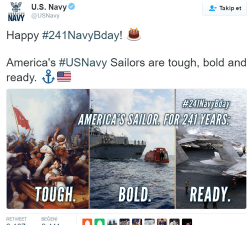 Donanmanın resmi Twitter hesabında, "Amerika'nın denizcileri çetin, cesur ve hazırdır." ifadesine yer verilen iletide, elinde Türk bayrağıyla savaşan askerlerin öldürüldüğünü gösteren temsili bir tablonun kullanılması tepki çekti.