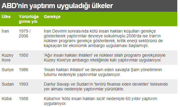 ABD'nin tüm ülkeyi hedef alan yaptırımları toplamda beş ülke için uygulanıyor. Bu yaptırımların büyük kısmı on yıllardır yürürlükte.