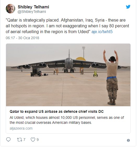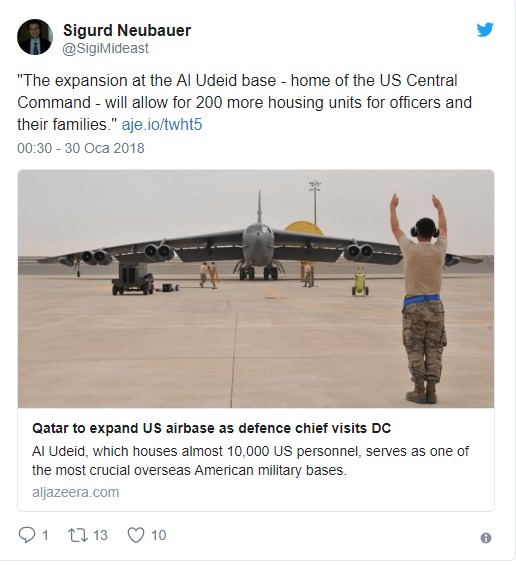 Katar Savunma Bakanı Halid bin Muhammed el Atiyye, ABD'nin konuşlandığı El Udeyd Hava Üssü'nü genişletme ve hem üssü hem de Amerikan askeri varlığını daimi hale getirme planlarını açıkladı.