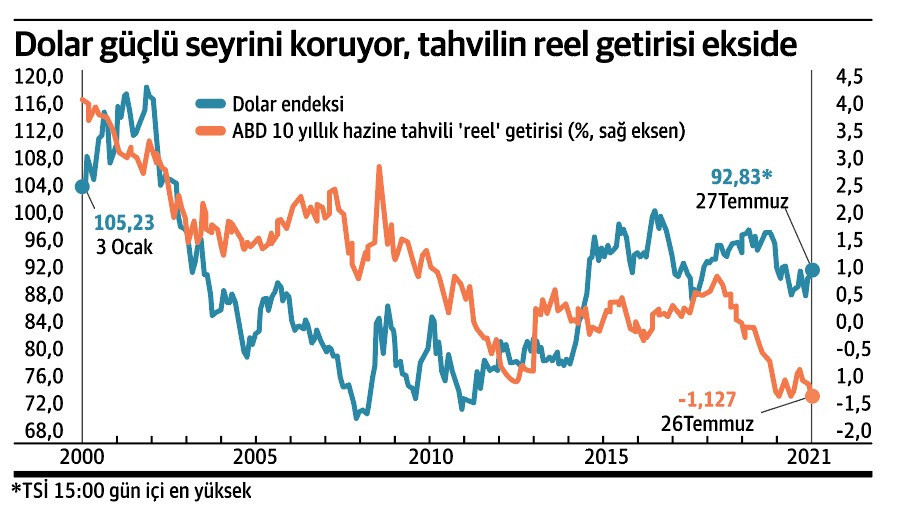 Japonya’nın en büyük bankası MUFG ABD Makro Stratejiler Direktörü George Goncalves, sadece ABD’de değil Türkiye gibi gelişmekte olan ülkelerde de şirketlerin borçlanma maliyetleri için önemli bir gösterge olan 10 yıllık ABD Hazine tahvilinin getirisinin düşmeye devam etmesini “teknik temellere” bağlıyor. Dün itibariyle 10 yıllık ABD tahvilinin getirisi yüzde 1,229 düzeyine kadar geriledi. Financial Times tarafından yapılan bir analize göre göserge tahvilin reel getirisi ise - Fed öncesi enflasyon beklentilerinin çok hafif düşmesi, artan vakalar ve büyümeye ilişkin endişelerin etkisiyle - eksiye indi. 10 yıllık ABD tahvilinin reel getirisi yüzde eksi 1,127’ye kadar gerileyerek daha önce hiç görmediği bir düzeye inmiş oldu.