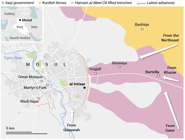 Anadolu Ajansı ise, kentin batısındaki Ayn Cahş ile güneydeki Hurta köylerinin IŞİD'den alındığını bildiriyor. Birlikler, güneydeki Hammam Alil'de IŞİD'in merkezi olarak bilinen ziraat fakültesi binasının dört kilometre uzağına kadar ilerledi. Ajans ayrıca, koalisyon güçlerinin IŞİD'in ikmal hattı olarak kullandığı kuzeydeki Abbasiye Köprüsü'nü vurduğunu aktardı.