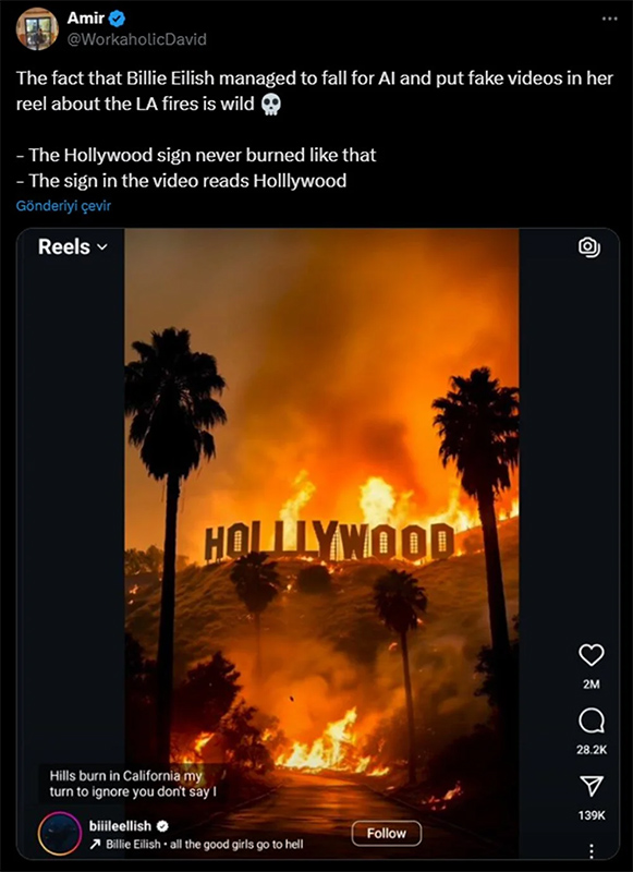 Yapay zeka kullanılarak üretilen bir görselde, ünlü "Hollywood" yazısının yandığı gösterildi. Ancak Los Angeles İtfaiyesi, bu fotoğrafın tamamen sahte olduğunu doğruladı.