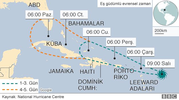 Kasırganın Çarşamba sabahı Türkiye saatiyle yaklaşık olarak 09:00'da Antiller'de karaya ulaşacağı bildiriliyor.