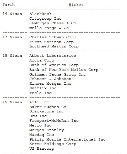 ABD'de toplam piyasa değeri 700 milyar doları aşan 6 büyük yatırım bankasının Citigroup, JPMorgan ve Wells Fargo dönemin ilk günü bilançolarını açıklayacaklar. Diğer üç büyükten Bank of Amerika (BofA) ve Goldman Sachs 18 Nisan'da ve Morgan Stanley 19 Nisan'da rakamlarını duyuracaklar.