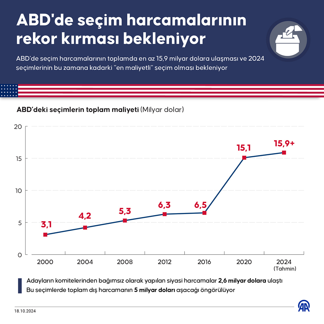 Söz konusu harcama tutarıyla 2024 seçimlerinin bu zamana kadarki en maliyetli seçim olacağı tahmin ediliyor. Bu yılki harcama tutarının, 2020 seçimlerindeki 15,1 milyar dolarlık rekor harcama tutarını da geride bırakacağı öngörülüyor.