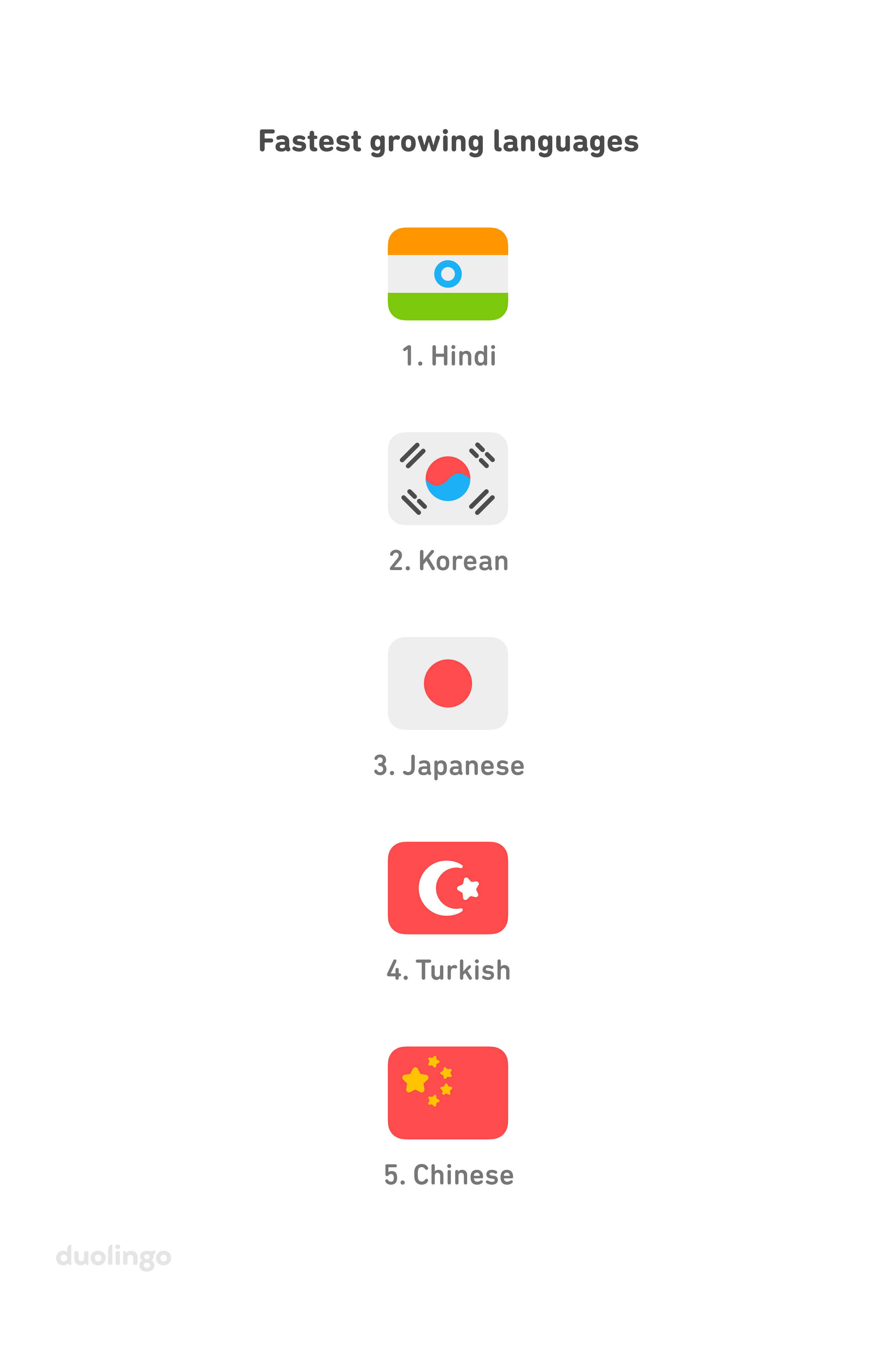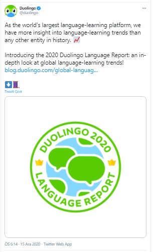 Dünya milyonlarcalarca yazılmış yabancı dil öğrenme uygulaması Duolingo, 2020 boyama raporunu yayımladı. Rapora göre ABD'de en hızlı büyüme diller birincil Türkçe (2019'dan bu yana yüzde 39 büyüme), Japonca, İngilizce, Hintçe ve Korece oldu.