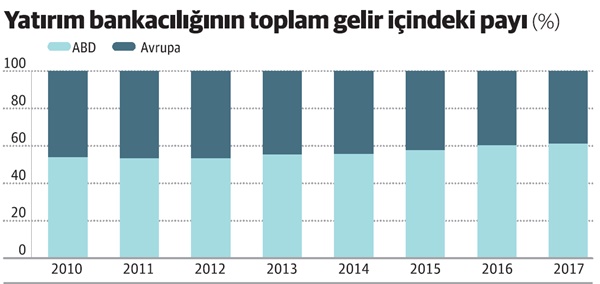 Avrupa’nın en büyük 5 bankası HSBC, RBS, BNP Paribas, Barclays ve Deutsche Bank’ın toplam geliri, 2008 yılında yaşanan küresel finans krizinin hemen öncesinde yeni 2007’de yıllık toplam 60 milyar dolara yakın seviyedeydi. Söz bankaların geliri ABD’li en büyük rakipleri JP Morgan Chase, Bank of America, Citigroup, Morgan Stanley ve Goldman Sachs’ın toplam gelirinden yüzde 20 fazlaydı. Şimdi ise tabloda dramatik bir değişim yaşanıyor. Avrupalı grupların net karı geçtiğimiz yıl üçte ikiden fazla daralarak 17.5 milyar dolara indi. Bir başka deyişle Amerikan JP Morgan’ın yıllık 24.4 milyar doları bulan gelirinin yüzde 25 altında gerçekleşti. JP Morgan’ın 380 milyar doları bulan piyasa değeri de söz konusu beş Avrupalı bankanın toplamından fazla. 2006-2016 döneminde en büyük 5 Amerikan bankasının küresel çaptı kurumsal ve ticari bankacılık gelirlerindeki payı yüzdesel bazda 6 puan arttı. Avrupalı bankaların payı ise 4 puan geriledi.