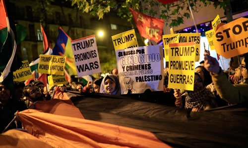 İspanya'nın başkenti Madrid'de sivil toplum örgütlerinin çağrısıyla ABD Büyükelçiliği önünde toplanan protestocular, "Terörist ABD", "Terörist Trump" sloganları attı.