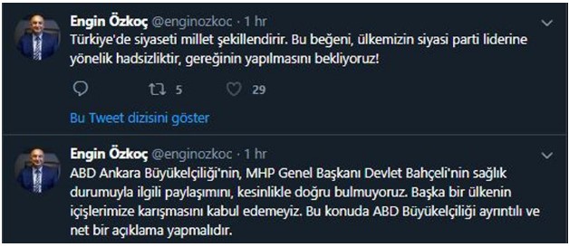 Başka bir ülkenin içişlerimize karışmasını kabul edemeyiz. Bu konuda ABD Büyükelçiliği ayrıntılı ve net bir açıklama yapmalıdır. Türkiye’de siyaseti millet şekillendirir. Bu beğeni, ülkemizin siyasi parti liderine yönelik hadsizliktir, gereğinin yapılmasını bekliyoruz!” ifadelerini kullandı.