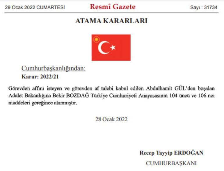 Buna göre, görevden affını isteyen ve talebi kabul edilen Abdulhamit Gül'den boşalan Adalet Bakanlığına Bekir Bozdağ getirildi.