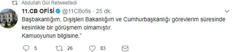 Düşünce, din ve siyaset anlayışım açısından hayatımın hiçbir döneminde yakınlık duymadığım bu örgüt lideri ile; Başbakanlığım, Dışişleri Bakanlığım ve Cumhurbaşkanlığı görevlerim süresinde kesinlikle bir görüşmem olmamıştır. Kamuoyunun bilgisine.”