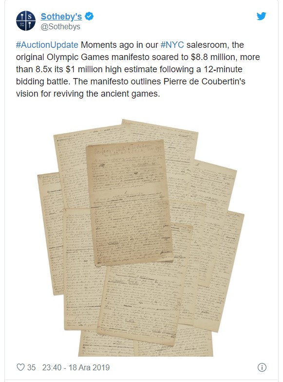 Olimpiyat oyunları manifestosunun orjinali New York’ta bir açık artırmada 8,8 milyon dolara (52 Milyon TL) satıldı. Böylece manifesto, spor tarihinin en pahalı koleksiyon parçası unvanını elde etti.