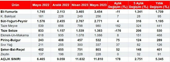 Birleşik Kamu-İş’in sonuçlarına göre, temel gıda fiyatlarında yaşanan yüksek oranlı artışlar dört kişilik bir ailenin açlık sınırını mayısta 178 lira daha artırarak 12 bin lira sınırına yaklaştırırken yoksulluk sınırı da 31 bin lirayı aştı.