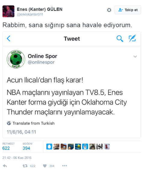15 Temmuz darbe girişinin baş sorumlusu olan Fetullah Gülen'e biat yemini eden Enes Kanter, Acun Ilıcalı'nın Oklahoma City Thunder'ın maçlarını yayınlayamayacağı bilgisini kendi sosyal medya hesabından alıntılayarak tepki gösterdi.