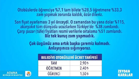 Adana Büyükşehir Belediye Başkanı Zeydan Karalar, otobüslerde öğrenci tarifelerine yüzde 7,1, tam bilet tarifesine yüzde 28,5, öğretmen tarifesine ise yüzde 33,3 zam yapıldığını Twitter hesabından yaptığı paylaşımla açıkladı.