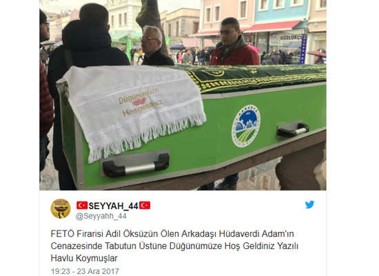 Adam'ın yakınları cenazede tabutun üstünü 'Düğünümüze hoş geldiniz' yazılı bir havlu örttü. Öğle namazı ve cenaze namazı boyunca tabut üzerinde duran havlu, cenaze kaldırılırken de aynı yerde durdu. Emekli profesör kılınan cenaze namazının ardından Serdivan'ın Meşeli Mahallesi Mezarlığı'nda toprağa verildi.