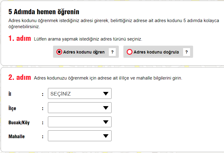 Linki kopyalayıp yeni sekmede açın. Açılan sayfada ADRES KODU ÖĞREN kısmına tıklayın.