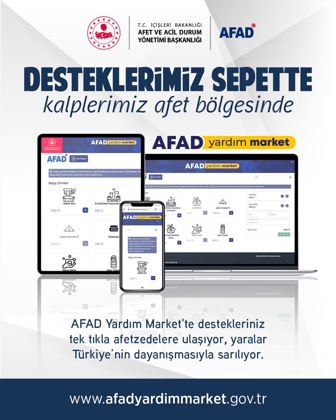 AFAD'ın sosyal medya hesabından, "AFAD Yardım Markette destekleriniz tek tıkla afetzedelere ulaşıyor, depremin yaraları Türkiye'nin dayanışması ile sarılıyor. Desteklerimiz sepette, kalplerimiz afet bölgesinde" ifadesi kullanıldı.
