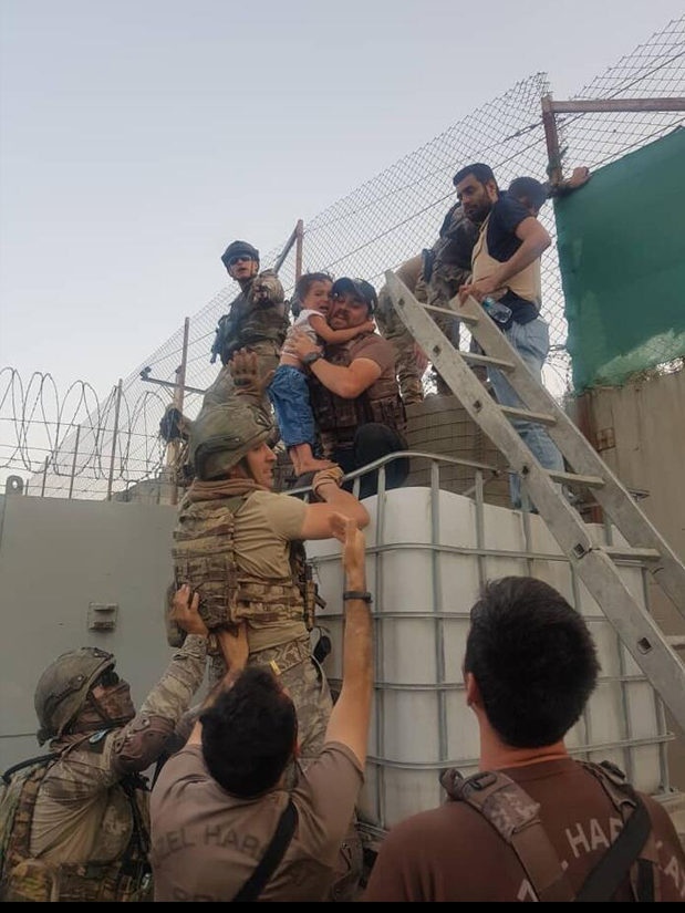 Öte yandan havalimanı kontrol noktalarında içeriye alınmak için günlerdir bekleyen Afganlar, havalimanını çevreleyen yaklaşık 5 metrelik duvarları da zaman zaman aşmaya çalışıyor. Bu sırada yaşanan izdihamda çocuklar ezilme tehlikesi geçiriyor. Havalimanı dışından askeri hat içinde kalan güvenli bölgeye girmek isteyen kalabalığın neden olduğu izdihamda ezilme tehlikesi yaşayan bir çocuk Türk askeri ve özel harekat polislerinin yardımıyla kurtarıldı. Ailesinin duvarın karşı tarafından uzattığı çocuk, güvenli bölgeye alındı. Kurtarılan çocuğun daha sonra ailesine teslim edildiği öğrenildi.