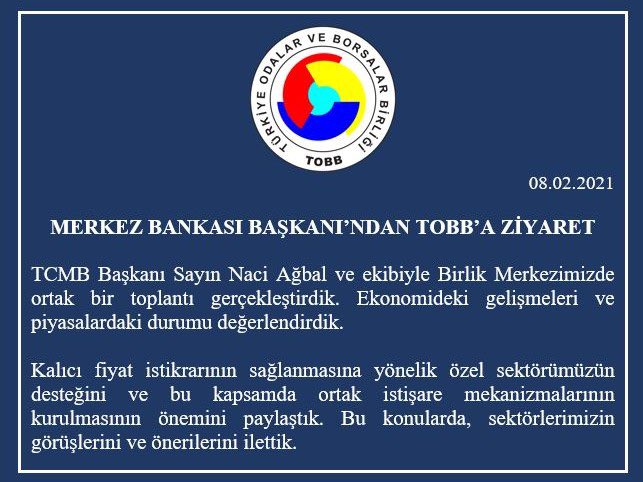 Merkez Bankası Başkanı Naci Ağbal TOBB ziyareti sonrasında yapılan açıklamada, “Fiyat istikrarı hedefine ilişkin bilgilendirme amacıyla TOBB ziyaret edildi. TOBB'in fiyat istikrarına yönelik güçlü desteğini görmekten memnunuz” denildi.