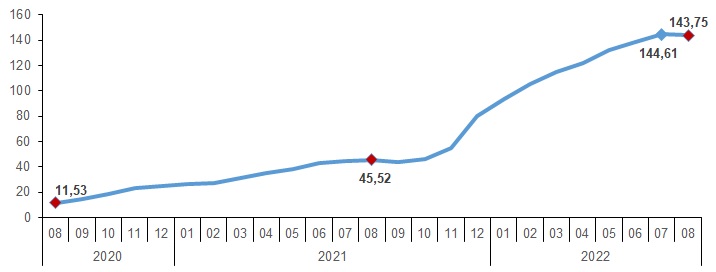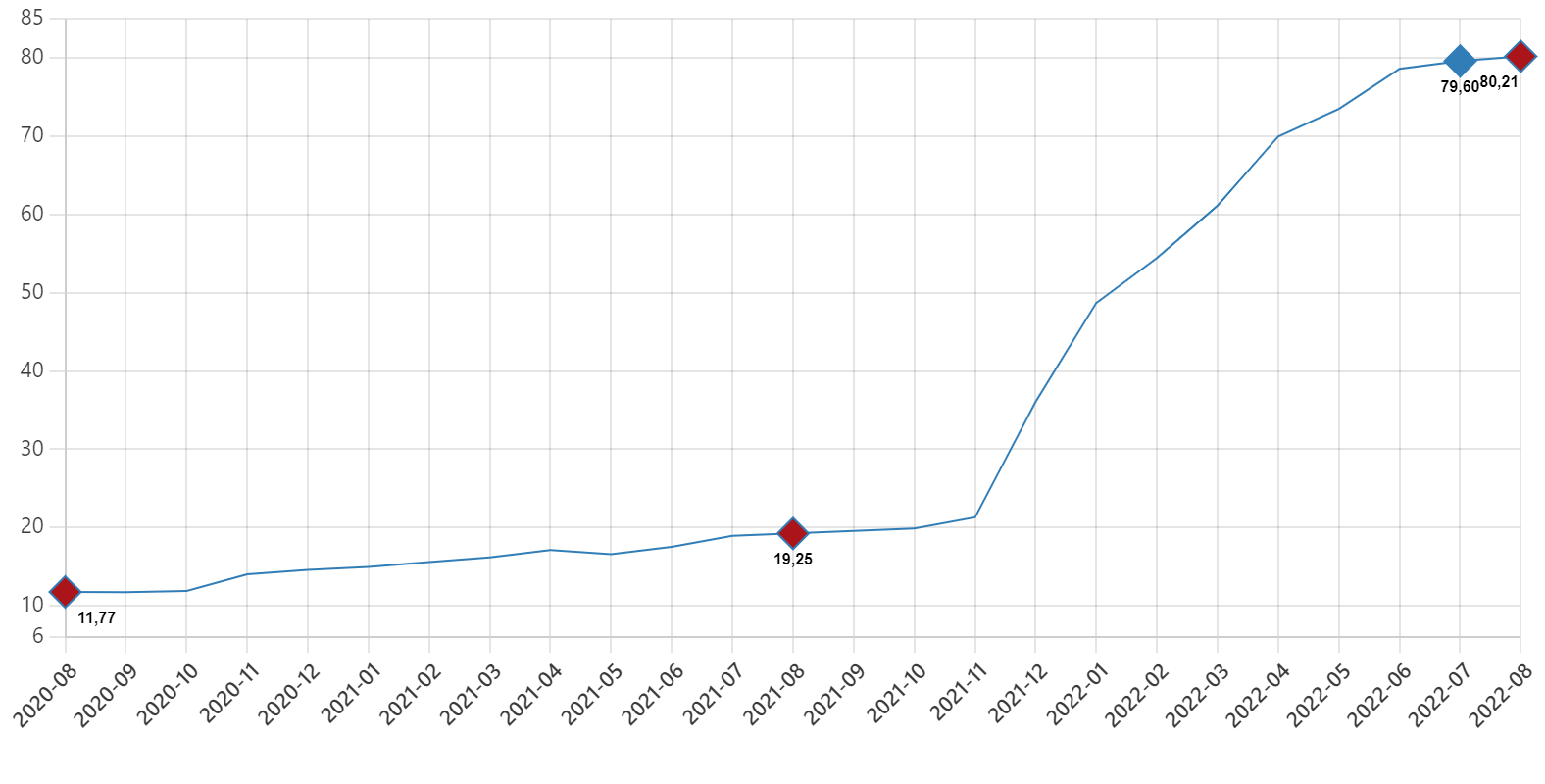Tüketici fiyatları, 2022 Ağustos ayında aylık bazda yüzde 1,46 arttı. 2022 Temmuz ayında yüzde 79,60 olan yıllık enflasyon 2022 Ağustos ayında yüzde 80,21'e yükseldi. Üretici fiyatları ise aylık bazda yüzde 2,41 artarken, yıllık Yİ-ÜFE yüzde 143,75 olarak gerçekleşti. Üst üste 15. ayda da yükselen tüketici enflasyonunda 24 yılın yeni zirvesi görüldü.