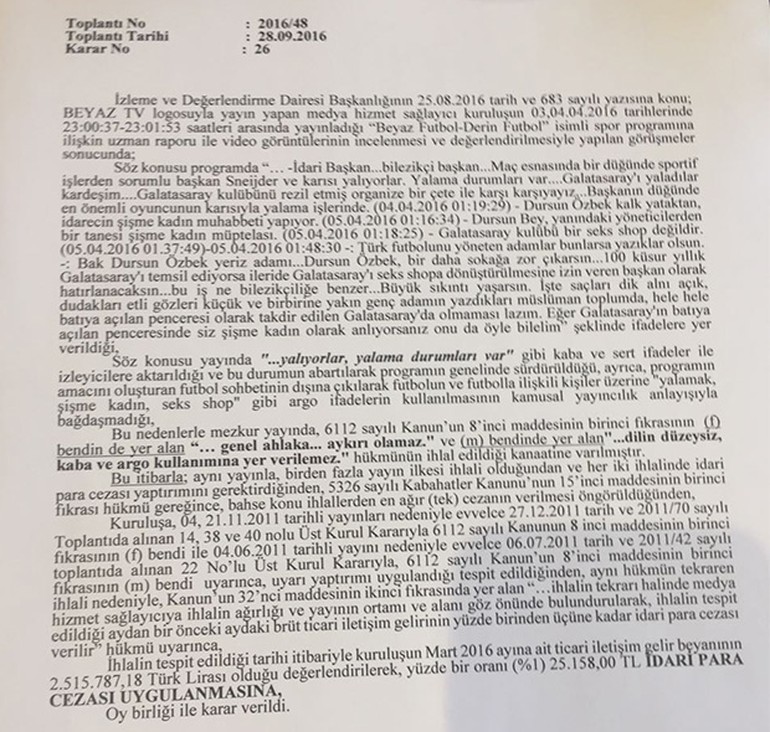 RTÜK, Beyaz TV'ye, “Yayınlar genel ahlaka aykırı olamaz” hükmü ile “Yayınlar, dilin düzeysiz, kaba ve argo kullanımına yer verilemez” hükümlerine dayanarak 2 ayrı maddeden oy birliğiyle ceza verilmesini benimsedi. Çakar'a 25 bin 158 TL para cezası verildi. (Sözcü)