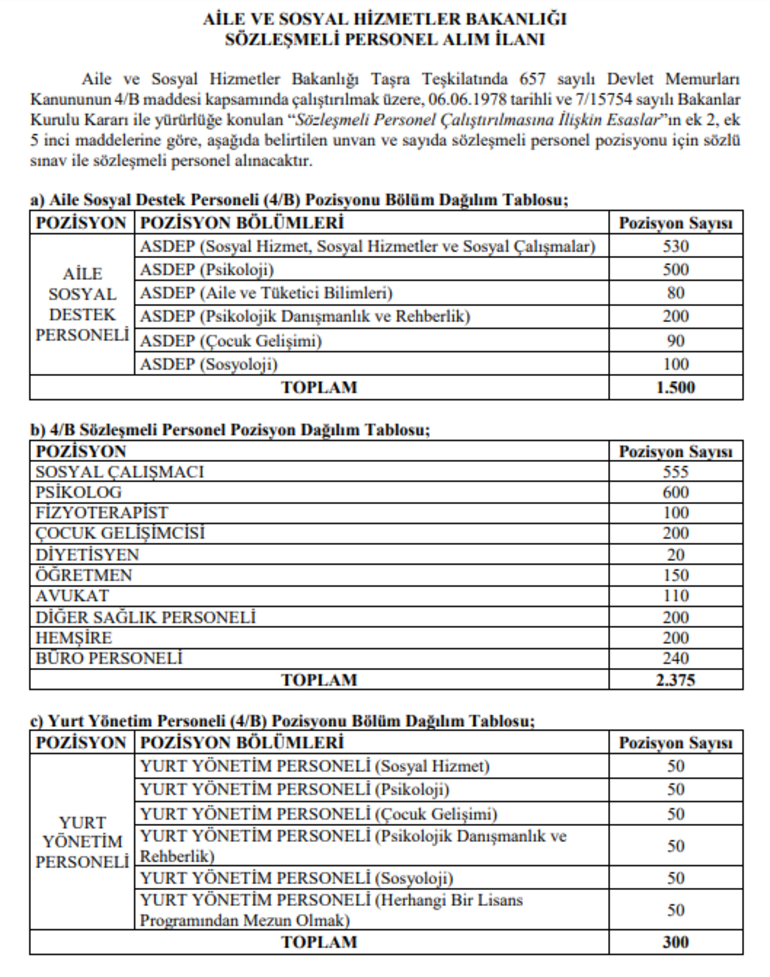 Aile ve Sosyal Hizmetler Bakanlığı Taşra Teşkilatında 657 sayılı Devlet Memurları Kanununun 4/B maddesi kapsamında çalıştırılmak üzere, 06.06.1978 tarihli ve 7/15754 sayılı Bakanlar Kurulu Kararı ile yürürlüğe konulan “Sözleşmeli Personel Çalıştırılmasına İlişkin Esaslar”ın ek 2, ek 5 inci maddelerine göre, belirtilen unvan ve sayıda sözleşmeli personel pozisyonu için sözlü sınav ile sözleşmeli personel alınacaktır.