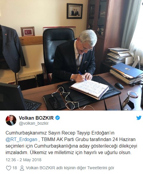 TBMM Dışişleri Komisyonu Başkanı Volkan Bozkır, sosyal medya hesabı ''Twitter'' üzerinden yaptığı açıklamada, ''Cumhurbaşkanımız Sayın Recep Tayyip Erdoğan’ın TBMM AK Parti Grubu tarafından 24 Haziran seçimleri için Cumhurbaşkanlığına aday gösterileceği dilekçeyi imzaladım. Ülkemiz ve milletimiz için hayırlı ve uğurlu olsun'' dedi