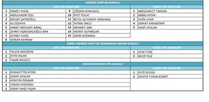 Bu kapsamda, Merkez Disiplin Kurulu asil üye adayları listesinde; Ahmet Aydın, Abdulkadir Özel, Nevzat Şatıroğlu, Ali Özkaya, Ahmet Mücahit Arınç, Zehra Taşkesenlioğlu Ban, Zeynep Yıldız, Serkan Bayram, Çiğdem Koncagül, İffet Polat, Betül Altunsoy Yanılmaz, Fatma Öncü, Mehmet Sarı, Murat Alparslan, Zahir Soğanda yer alırken, yedek üye aday listesinde Abdulmecit Tarhan, Abbas Aydın, Fatih Uyar, Serhat Karademir ve Vahit Atalan yer aldı.